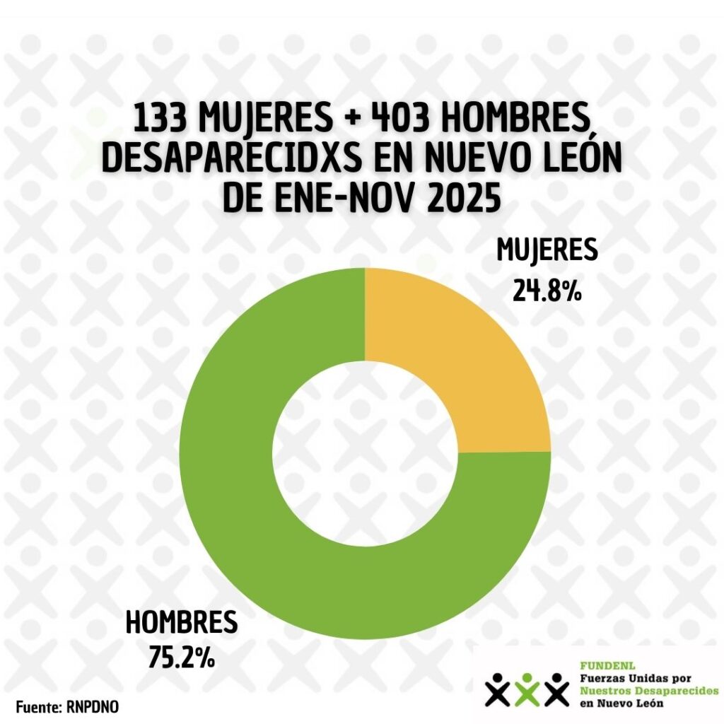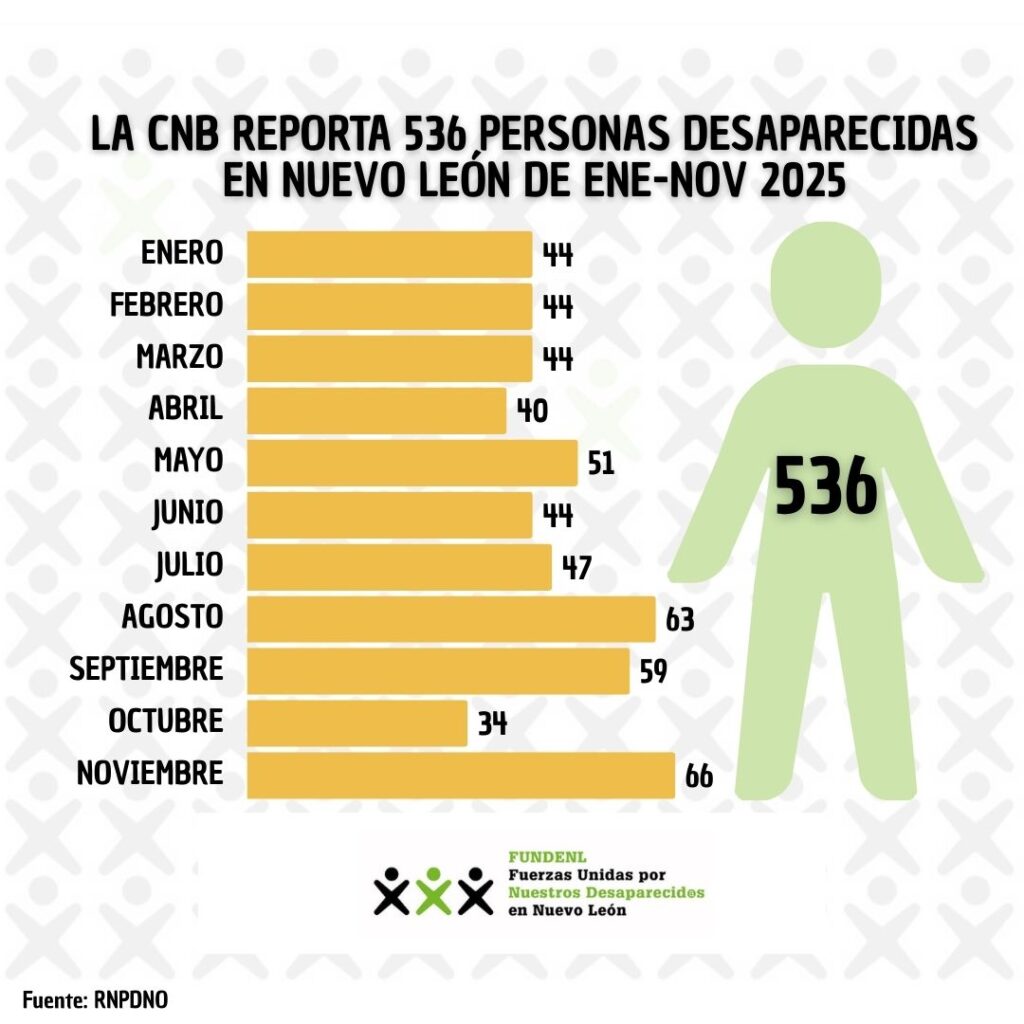 • De enero a noviembre de 2025 a través del RNPDNO la CNB reporta 536 casos de #PersonasDesaparecidas en #NuevoLeón, mientras que la Fiscalía Estatal reporta sólo 214 Delitos contra la Libertad y Desapariciones en el mismo periodo.