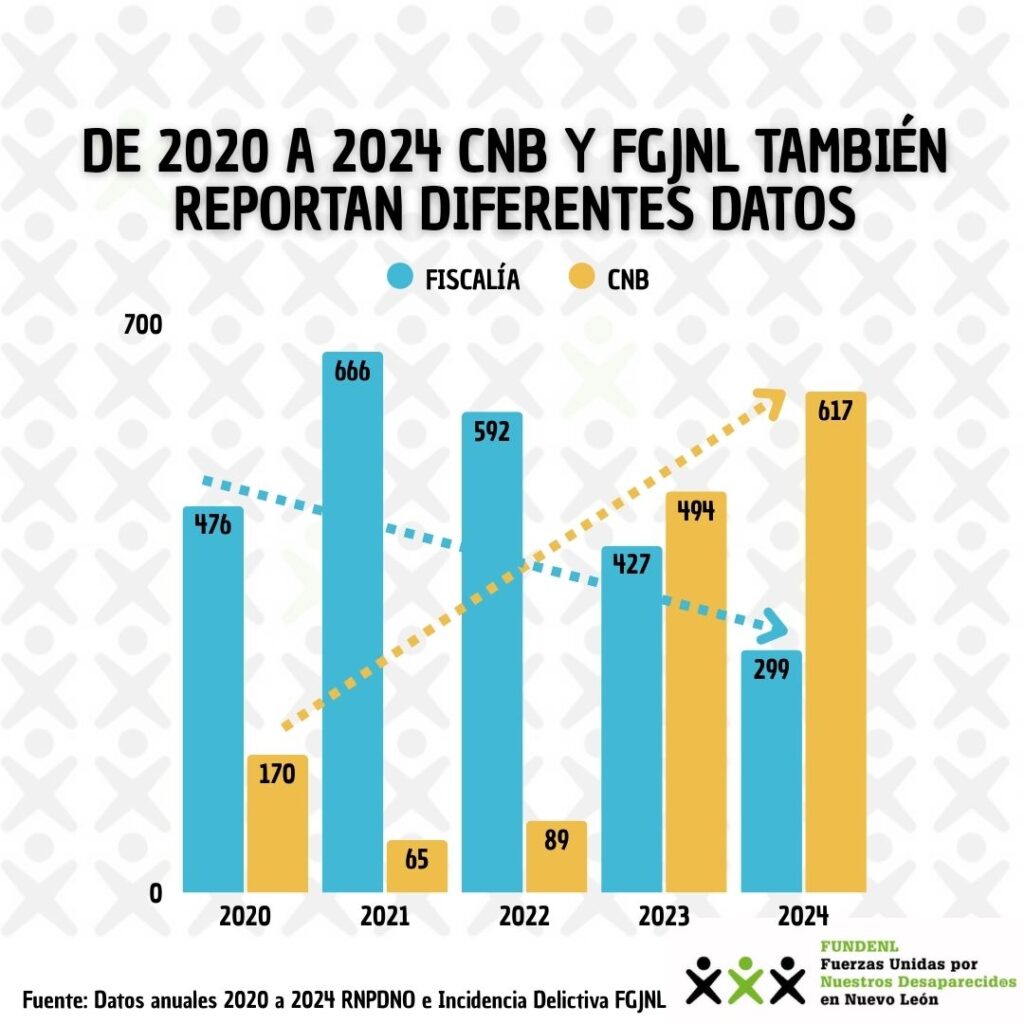 • De 2020 a 2024 los datos anuales de la CNB y FGJNL de Desapariciones y Delitos contra la Libertad en Nuevo León, tampoco coinciden y mientras que los datos de la CNB marcan una tendencia a la alta, los datos de la Fiscalía muestran una tendencia hacia la baja.